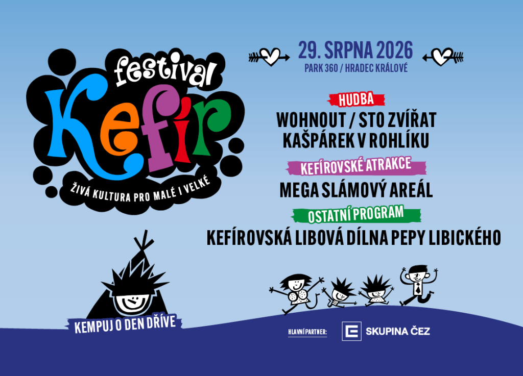 Hudba, divadlo, cirkus, popelářský vůz i čtení na postelích s nebesy. Festival Kefír se vrací s pořádnou dávkou fantazie, bejbypanku a zážitků pro děti i dospělé. Rodinný festival, který bourá hranice mezi žánry i generacemi, se uskuteční v sobotu 29. srpna 2026 u nás v Parku 360 v Hradci Králové. Festival je vyhlášený svým mottem „plnotučná živá kultura“ a letošní ročník mu bude zcela věrný. Všechny osobně pozdraví a provede areálem legendární ředitel vesmíru Kašpárek!